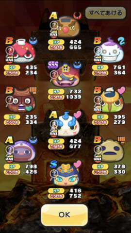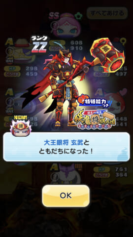 10連x6回(60回)で確率アップしている大王銀将玄武が1体、確率アップしていない大王軍キュウビ(シャドウ)が1体出ました。