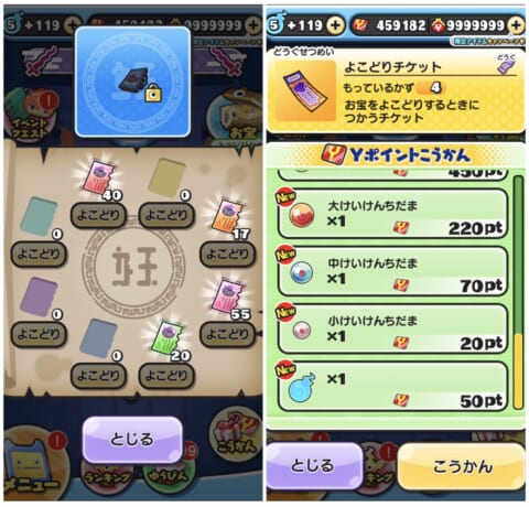 ガシャ、育成(レベル上限開放)、スコアタ、敗戦、リタマラ(レア妖怪)、好物購入など