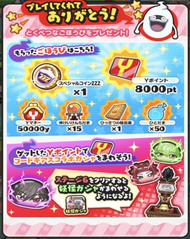 新規で妖怪ウォッチぷにぷにを始めると「オレのともだち召喚キャンペーン(おかえりキャンペーン)」のキャンペーン#3の報酬としてYポイント8000ptがプレゼントされます。(LINEで招待されていなくても貰えます)