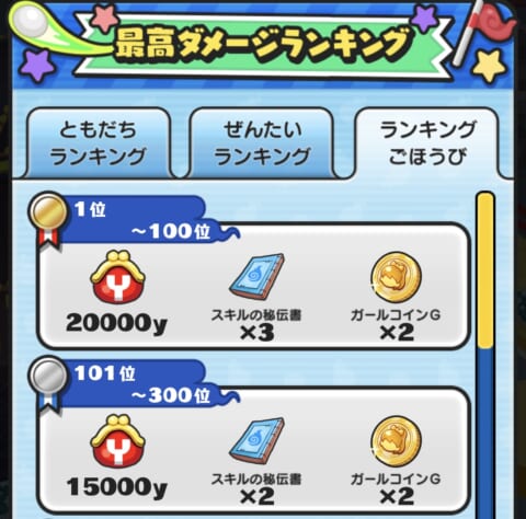 ゴルフの最高ダメージを競うランキングで上位に入賞するとコインが貰えます。