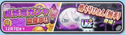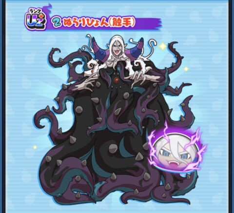 超妖魔ガシャでは新キャラ「ぬらりひょん(触手)」が登場し、少し育成された状態(レベルMAX&技レベル3)で仲間になります。