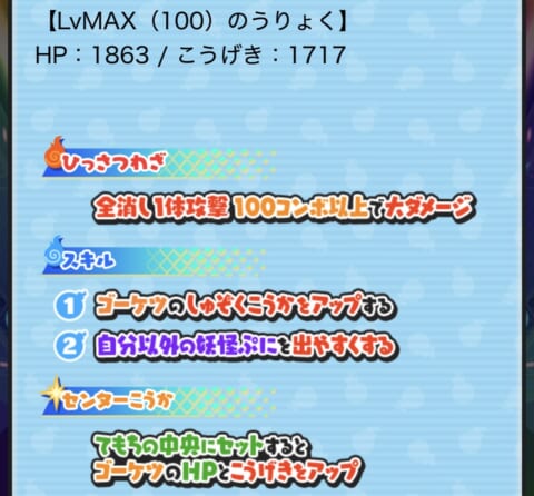 • おぼろ入道:全消し(100コンボ)(技)/種族効果アップ(ス)/自身が出にくい(ス)/ゴーケツ強化(セ)