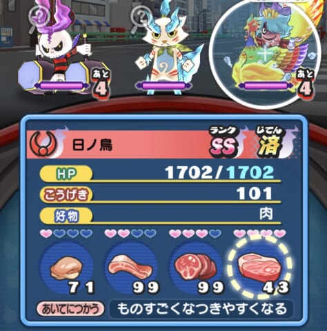 日ノ鳥の好物はです。好物を与えて、なつき度を上げましょう。