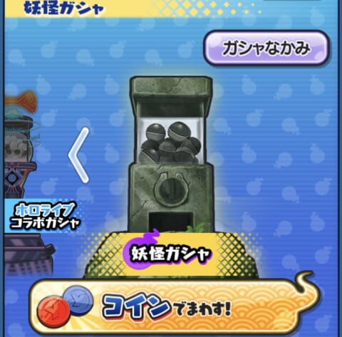 メニューの「妖怪ガシャ」を開き、「コインでまわす!」から好きなコインを選択し「つかう」タップしましょう。