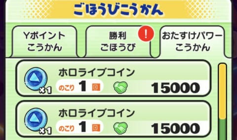 フレンドのゴルフを助けるともらえる「おたすけパワー」でも「ホロライブコイン」を2個手に入れることができます。