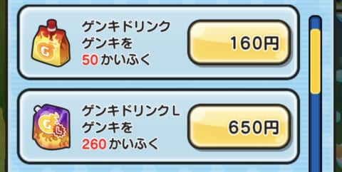 ゲンキは5分で1G回復し、最大50Gまで時間経過で回復しますが、ゲンキドリンクを使って一気に50G回復することもできます。