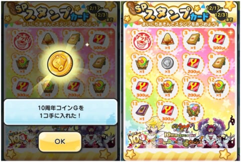 イベント期間中、ログイン日数1日目に「10周年コインG」、6日目に「10周年コイン」が1個ずつもらえます。