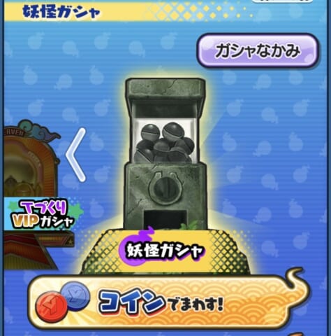メニューの「妖怪ガシャ」を開き、「コインでまわす!」から好きなコインを選択し「つかう」をタップしましょう。