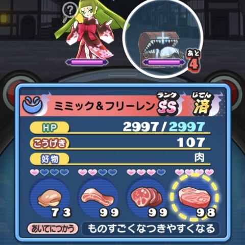 ミミック&フリーレンの好物は肉です。好物を与えて、なつき度を上げましょう。