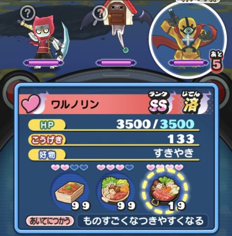 ワルノリンの好物はすきやきです。好物を与えて、なつき度を上げましょう。