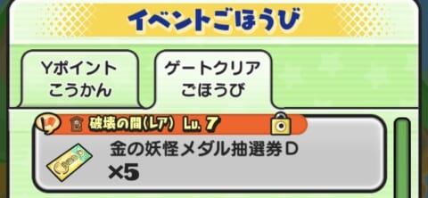 - 「金の妖怪メダル抽選券D」は最大99枚まで所持できます。所持している抽選券の数が多いほど当選確率が上がりますが、99個所持していても落選の可能性があります。