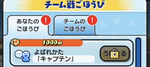 おはじきでVSポイントを1,000pt集めると、チーム戦の個人ご褒美で呼ばれ方「キャプテン」がもらえます。