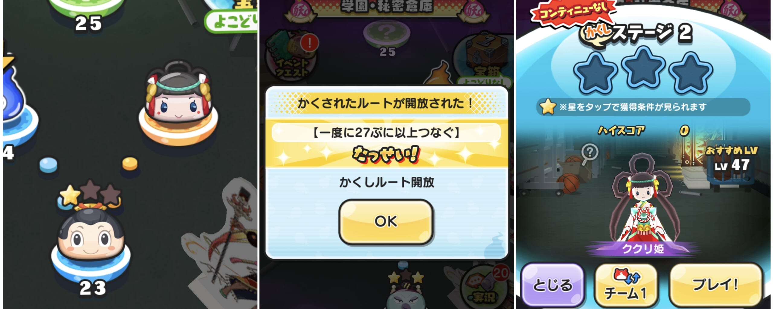 【ステージ解放のコツ】 大量ぷに消しの必殺技を持つ妖怪を使うと簡単にコンボが稼げます。大量消し+速射(スキル)を持つ妖怪が特におすすめです。 【おすすめ妖怪】 ・大量消し: 完全体シオン / ガッコウガーENMA |