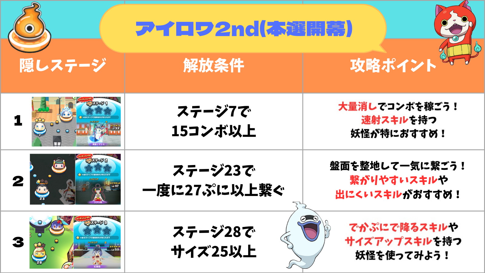 【ステージ解放のコツ】 自身の妖怪ぷにが「でかぷにで降る」スキルや、細かく繋げると簡単にでかぷにが作れる「サイズアップ」のスキルを持つ妖怪を使ってみましょう。 【おすすめ妖怪】 |