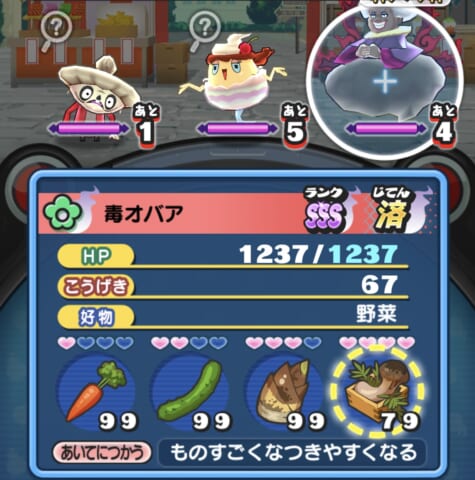 毒オバアの好物は野菜です。好物を与えて、なつき度を上げましょう。