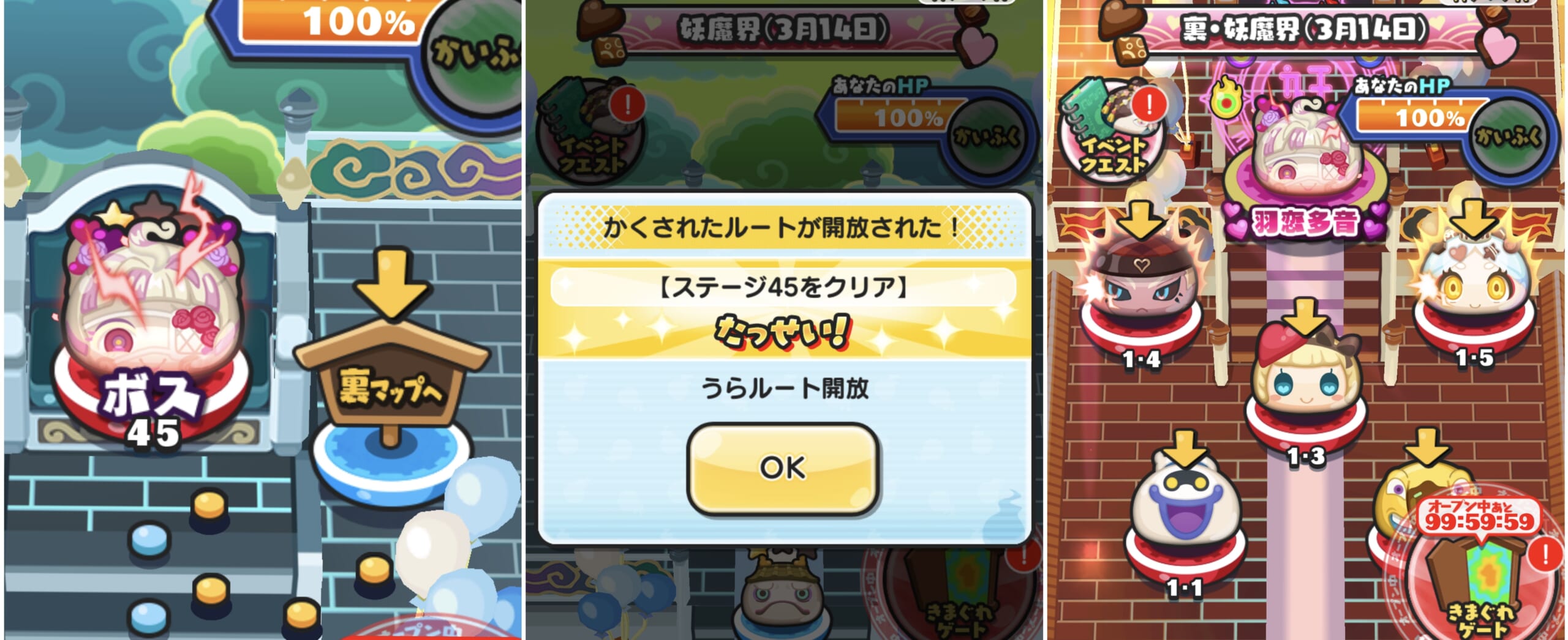 裏マップ「裏・妖魔界(3月14日)」では封印ボス(羽恋多音)や中ボスたちと戦うことができます。ボスのパワーを封印したり、特攻キャラを使って倒しましょう!