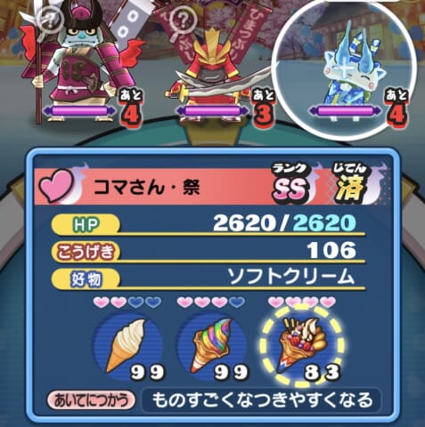 コマさん・祭の好物はソフトクリームです。好物を与えて、なつき度を上げましょう。