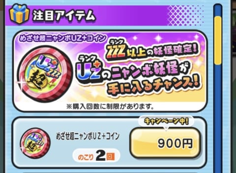『妖怪ウォッチぷにぷに』で使える「めざせ超ニャンボUZ+コイン」の中身をご紹介します。