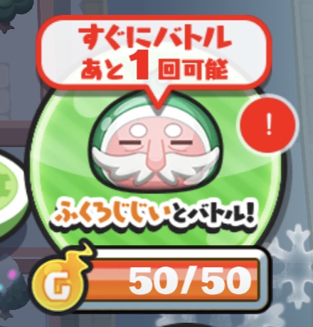 フレンドさんが「ふくろじじい」や「極ふぶき姫」とおはじきバトルを始めると、イベントマップの右下にある「ふくろじじい」のアイコンに「!」マークがつきます。