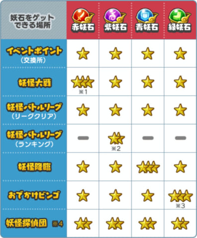 ※4:将来実装される妖怪探偵団バトルで入手可能です。イベントごとにもらえる妖石の種類は1種類となります。