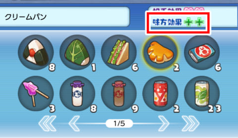 妖怪とバトルする際、相手の妖怪に食べ物を与えると「ともだち確率アップ」の効果が発揮され、バトル後に相手の妖怪が仲間になる確率がアップします。