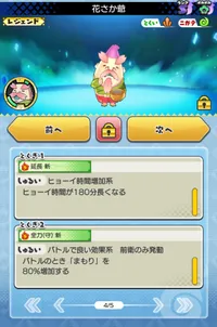 あ、100体の時は、ハート1の好物が基本で、時々ハート2を出してました。 花子の場合は、ハート2のバリうまスナックが潤沢だったので、ハート2が基本で、 時々ハート3です。 大体、「これが最後のバトル」というときと、さすらい玉のハートが出てチャンス と思ったときに、1つ上のハートを使うようにしてます。(実際はさすらい玉の効果 を感じたことが無いんですけど、チャンスと信じて・・・)