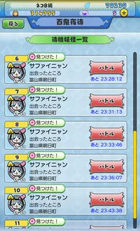 富山県南砺市にセンポクをゲットした帰りの 乗り換え駅「泊(とまり)」で停車30分で サファイニャン乱獲してきました。 朝日町に入ったと同時にサーチし発見したら 百鬼に待機を繰り返して合計15体、うち3体が 友達になりました。宝石ニャン系では入手が一番 簡単だと思います、現地に木を植えてきましたが 3日経ってもかかりませんでした。
