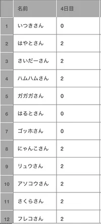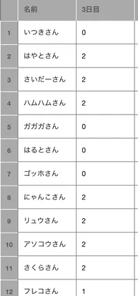 1日 2日 3日 4日 5日 いつきさん 1 0 0 はやとさん 2 1 2 さいだーさん 1 0 2 ハムハムさん 1 0 2 ガガガさん 0 0 0 はるとさん 1 0 0 ゴッホさん 1 0 0 にゃんこさん 1 0 2 リュウさん 1 0 2 アソコウさん 1 0 2 さくらさん 1 0 2 フレコさん 2 0 2 濱カニカマさん 1 0 1 マヨネーズさん 0 0 0 フレミカさん 2 1 2 ハマーン様さん 0 0 2 坂口現行犯さん 1 0 0 天然イチゴさん 0 0 1 にーとさん 1 0 0 はるミンさん 0 0 0 やきそばさん 0 0 0