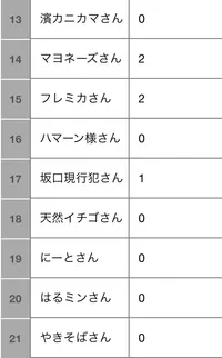 合計 順位 DL いつきさん はやとさん さいだーさん ハムハムさん ガガガさん はるとさん ゴッホさん にゃんこさん リュウさん アソコウさん さくらさん フレコさん 濱カニカマさん マヨネーズさん フレミカさん ハマーン様さん 坂口現行犯さん 天然イチゴさん にーとさん はるミンさん やきそばさん