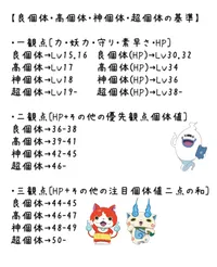 価値が発生する基準については、下のURLのスレの 【良個体・高個体・神個体・超個体の基準】 というところに書いてあります。 高個体の条件を満たしていても妖怪ごとに求められるステータスは違うため、一度質問掲示板などで需要があるか質問してみてもいいでしょう。 https://youkai.gamepedia.jp/yw3/comments/1480994/