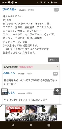求)無償 出)なまはげ、黄泉ゲンスイ、オオクワノ神、 コタロウ、酒呑童子、スノーラビィ、ゴルニャン、 大ガマ、カブキロイド、エル・シャクレロ、ふぶき姫、絶オジイ、心オバア、カンフーマッハ、 虫歯伯爵、毘沙門天、福禄寿、ニャン騎士、 ニャン魔女、シロカベ、ステーキング、 ロボニャンF型、サファイニャン、ルビーニャン、 ダイヤニャン、ガシャどくろ、ウィスババ、 イヌニャン、むりだ城、ワンダーニャン、など 2体以上持っている妖怪をお譲りします。 基本被りは一体しかいないので 先着順とさせていただきます。 在庫が知りたい方はコメントしてください。 ・ 別件 求)無償で妖怪を貸してくださる方 大辞典埋めのために妖怪を貸して欲しいです。 詳細を聞きたい方はコメントor 私の投稿に同じようなスレがあるので そちらを探してみてください。